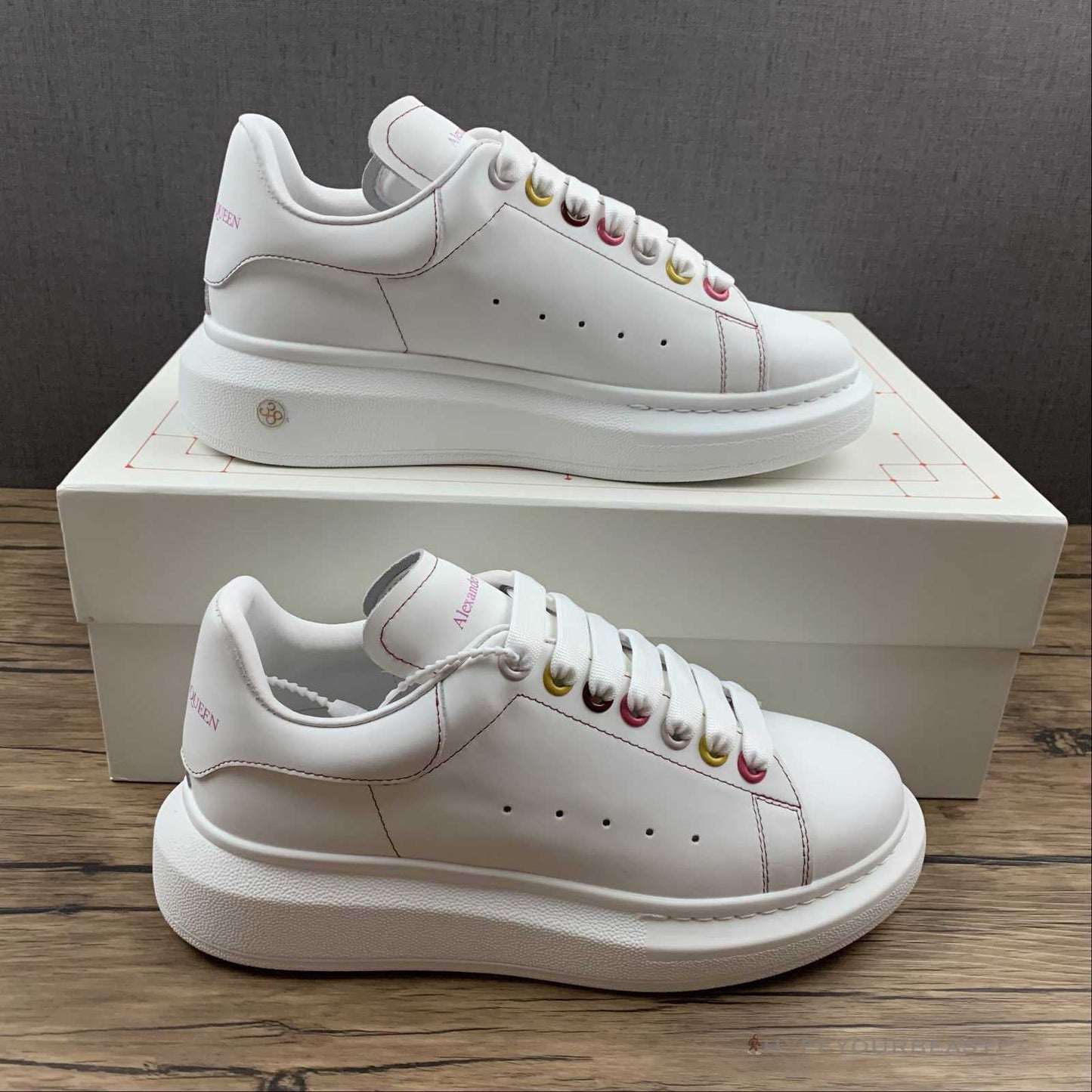Never miss out on the white-themed sneakers through Alexander McQueen White / White / Pink. These sneakers showcase an all-white construction on your feet, including their upper, heels, and soles. However, these sneakers highlight the colorful eyelets in pink, yellow, cream, and red tones. To complete the look, Alexander McQueen White / White / Pink also blends little pink stitches all overall the upper.