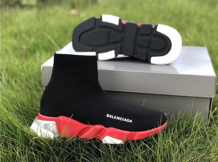 Balenciaga Speed Trainer Clear Sole Black Red highlights the terrific colorway of black, red, and white for sock sneakers. It is super light, easy, and ergonomic to use for both running or walking errands. These sneakers include black technical 3D knitting on the upper with a white logo branding name on the side food. As for its midsoles, it has sharp and sleeking red carvings and a clear sole on the heel. Its outsoles also possess red and black rubbers