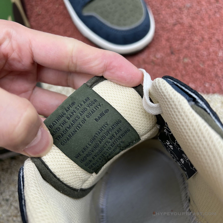 Bape Sk8 St Blue gives you a darker tone colorway with sleek white touch. These sneakers feature army green tones as the bases with navy blue accents on the forefoot, side panels, eyelets, and heels. It even highlights the gray logo on the mudguard and heel tabs. Blue Bape Sta Sneakers is completed with white midsoles and dark blue rubber outsoles.