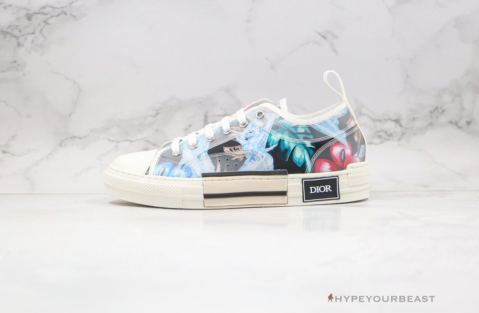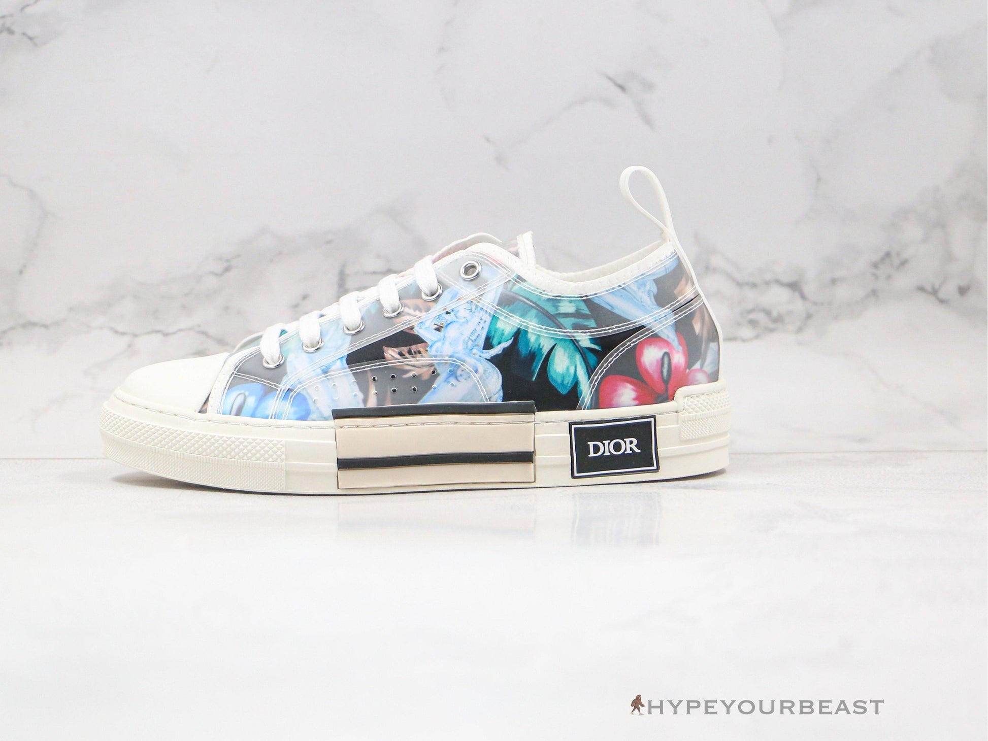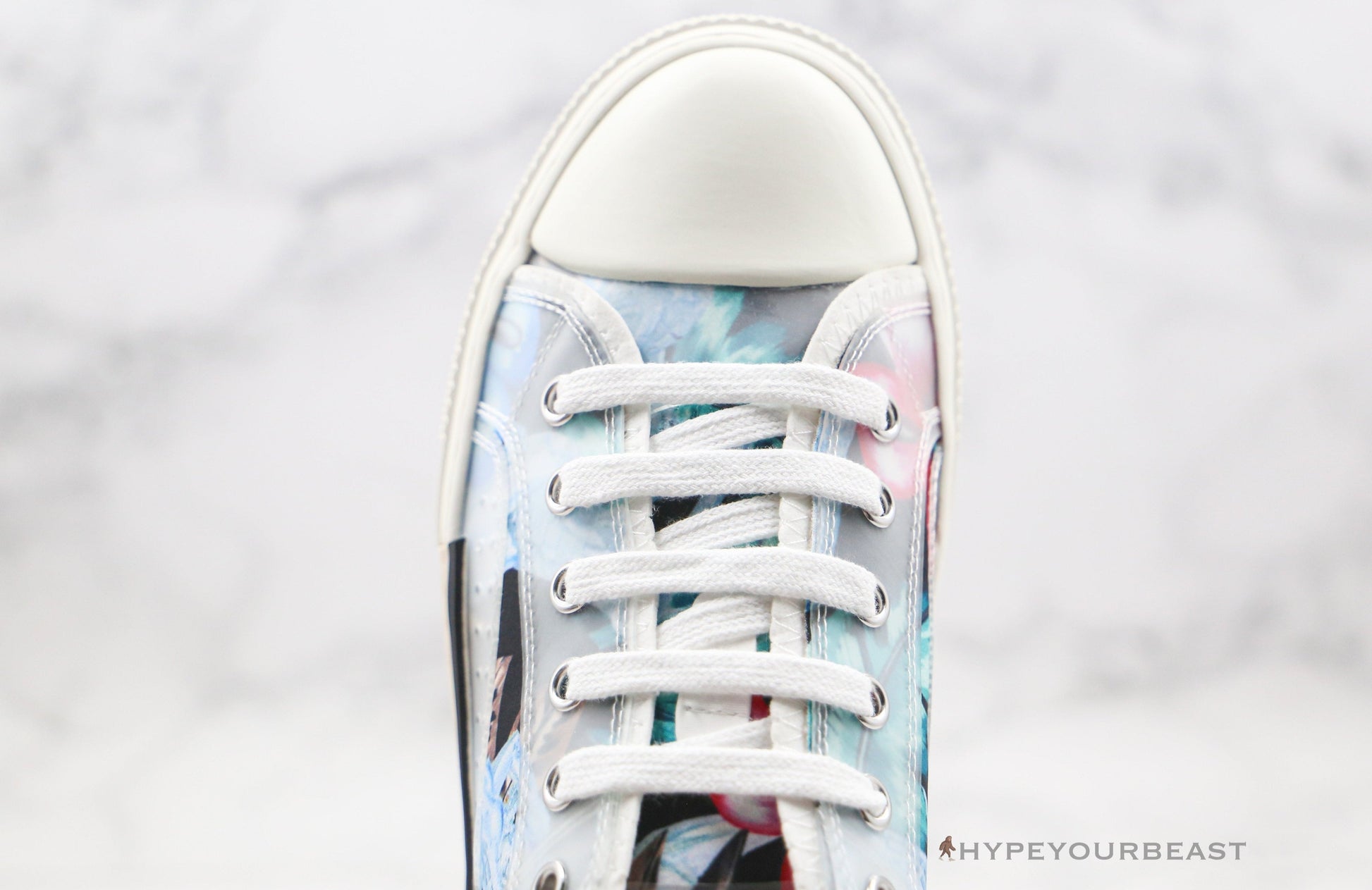A multicolor pair of Dior B23 Low top multicolor sneakers embraces astonishing prints and style. This low-top footwear brings out summer feels with its colorful beach leaves prints with a black backdrop. These sneakers also carry the iconic white translucent overlays which top the prints creating a new design. Dior B23 Low top multicolor sneakers are completed with a Dior branding on the thick white midsoles with a classic Dior color patch of blue and cream on the side. Own a pair of these classic low-top sneakers and experience its exceptional style on your feet.