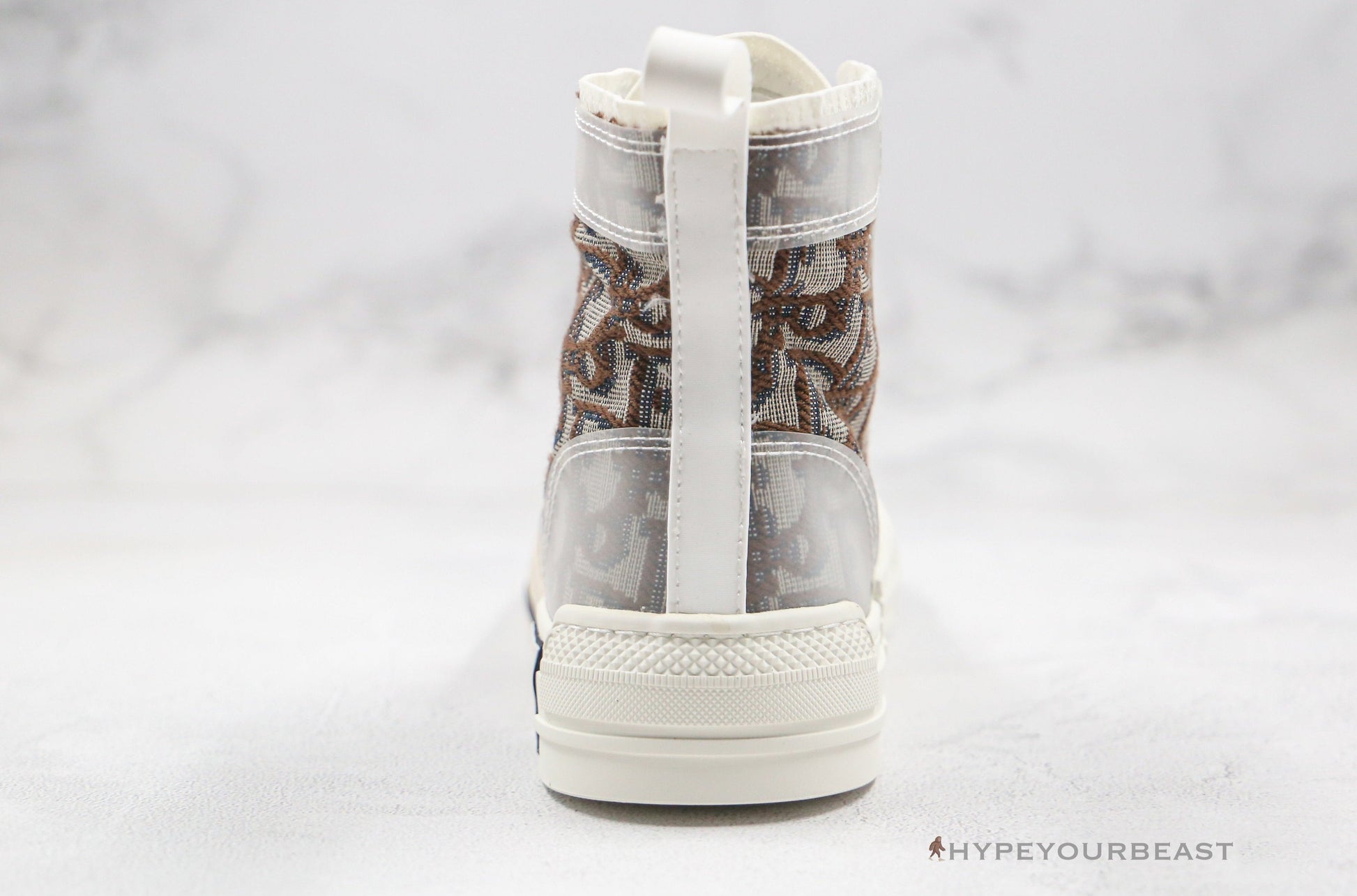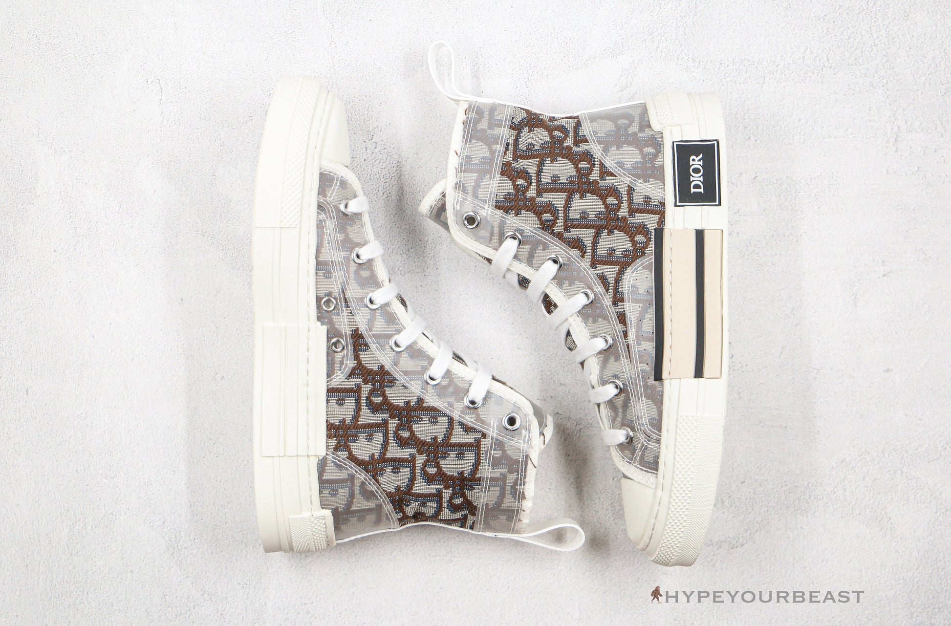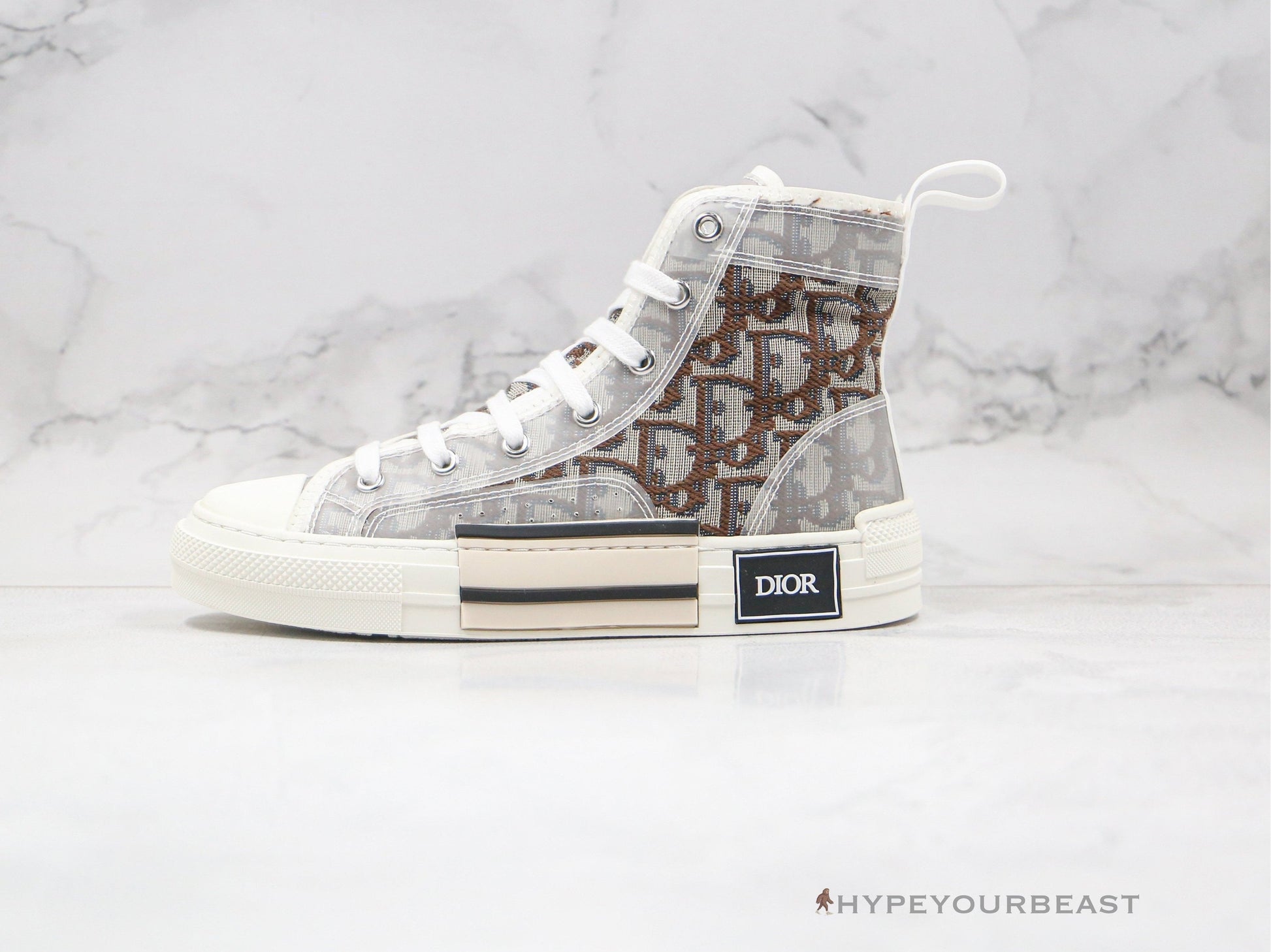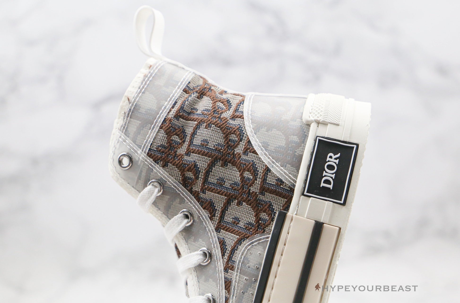 Striking high-top sneakers with brown Dior prints are showcased on the Dior High Top White Brown. This pair of footwear features the classic Dior logo prints in brown color. It even includes clear translucent overlays which made it more contemporary. The sneakers also have white pull-on tabs, white forefoot, white lacing system, and white midsoles. Other than that, Dior also added the stunning black and cream patch and Dior logo patch on the midsoles for extra style. Wear this pair of charismatic vintage sneakers and nail its overall look on your feet.