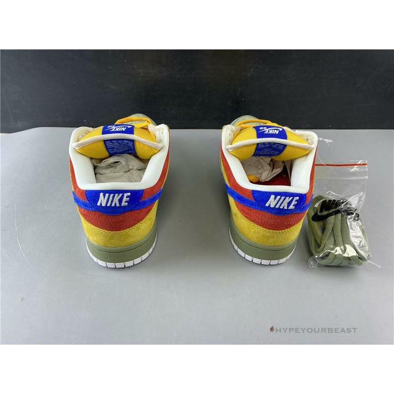Nike SB Dunk Low Puff N Stuff consists of fabulously combined colors from the brilliant mind of Liam Sean Martin. These sneakers honor the H. R. Pufnstuff television program in the late 60s and early 70s. It features the characters to reflect on the shoes' colors. It brings all the excellent suede constructed with green upper and midsoles. Nike SB Dunk Low Puff N Stuff also includes blue Nike Swoosh, red heels, yellow on ankles, and a lacing system.